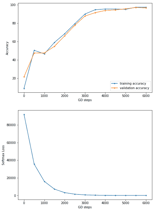现在,让我们用 TF 实现深度学习图像分类。首先,我们需要加载mnist数据集,并将训练图像分为两部分,第一部分是较大的(我们使用 50k 图像)进行训练,第二部分(10k 图像)用于验证。让我们重新格式化标签,用一个热编码的二进制向量表示图像类。然后需要初始化tensorflow图以及变量、常量和占位符张量。使用小批量随机梯度下降(SGD优化器)作为学习算法,批量大小为 256,在两个权重层(超参数值为λ1=λ2=1)上使用 L2 正则化器最小化 softmax 交叉熵 logit 损失函数。最后,TensorFlowsession对象将运行 6k 步(小批量),并运行前向/反向传播以更新学习的模型(权重),随后在验证数据集上对模型进行评估。可以看出,最终批次完成后获得的精度为96.5%: