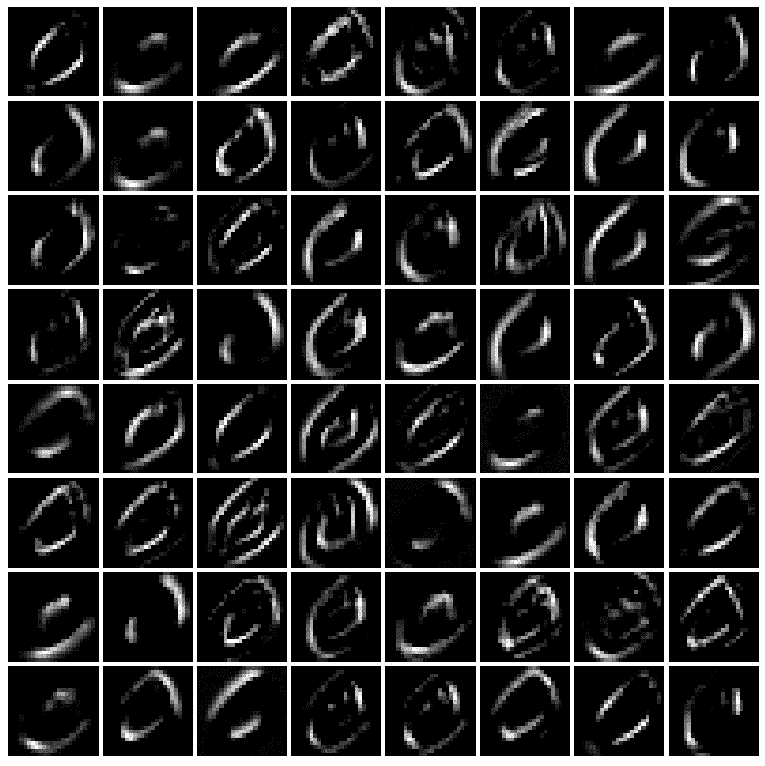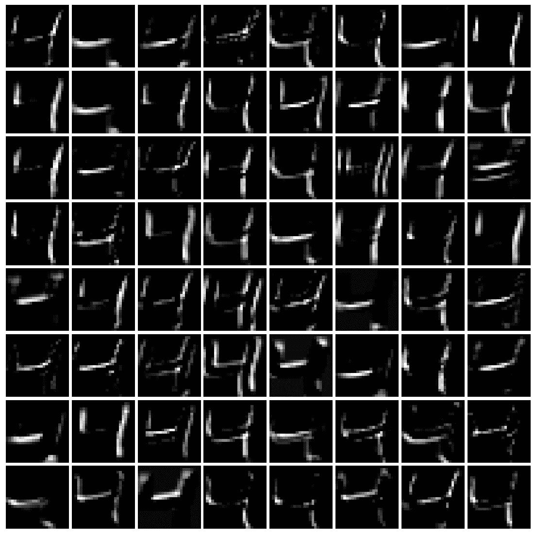通过更改前一代码段中的单行,我们可以可视化在第二个块的第二个卷积层中使用前 64 个过滤器为同一个狗图像学习的特征:
