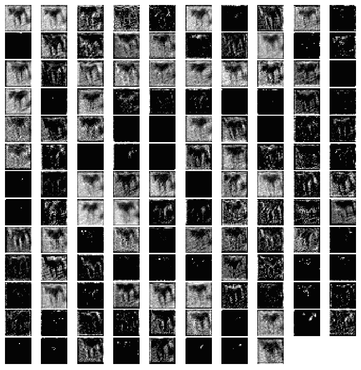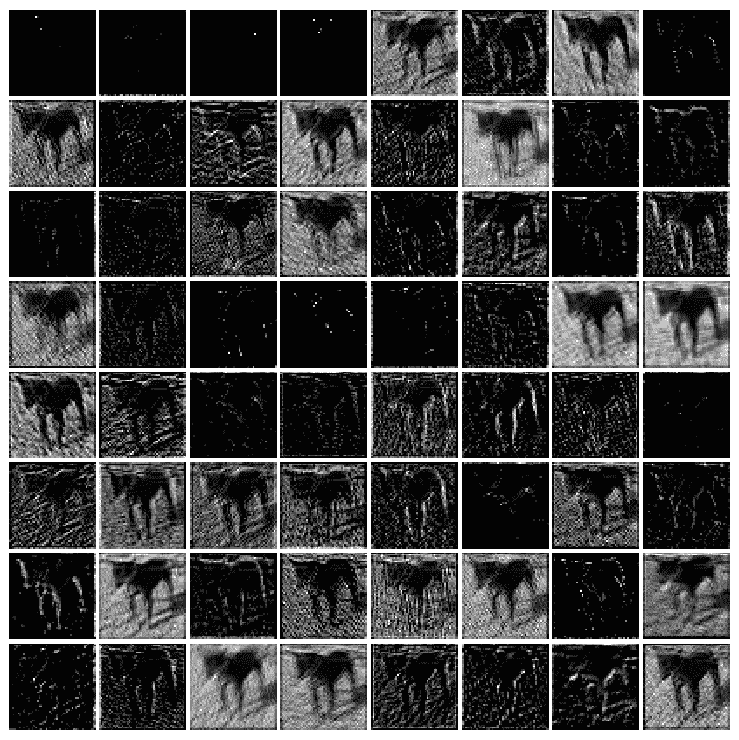 以下屏幕截图显示了之前代码的输出,即为模型的同一狗图像学习的特征图: