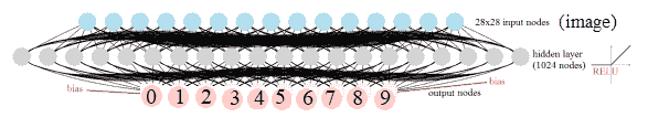 首先,我们将从一个非常简单的深层神经网络开始,该网络只包含一个 FC 隐藏层(具有 ReLU 激活)和一个 softmax FC 层,没有卷积层。下一个屏幕截图显示了网络颠倒。输入是一个扁平图像,包含隐藏层中的 28 x 28 个节点和 1024 个节点,以及 10 个输出节点,对应于要分类的每个数字:
