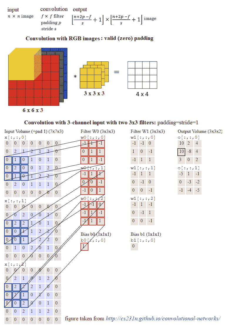 CNN 的主要组成部分是卷积层。卷积层由一组卷积滤波器(内核)组成,我们已经在第 2 章、采样、傅里叶变换和卷积中详细讨论了这些滤波器。使用卷积滤波器对输入图像进行卷积,以生成特征映射。左侧是卷积层的输入;例如,输入图像。右边是卷积滤波器,也称为内核。通常,卷积运算是通过在输入上滑动该滤波器来执行的。在每个位置,元素矩阵乘法的和进入特征映射。卷积层由其宽度、高度(过滤器的大小为宽度 x 高度)和深度(过滤器数量)表示。步长指定卷积过滤器在每一步移动的量(默认值为 1)。填充是指环绕输入的零层(通常用于保持输入和输出图像大小相同,也称为相同填充。以下屏幕截图显示了如何在 RGB 图像上应用 3 x 3 x 3 卷积滤波器,第一个使用有效填充,第二个使用两个大小为步长=填充=1的此类滤波器进行计算: