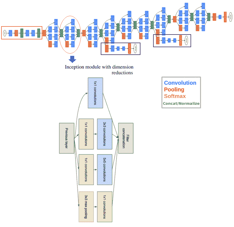 inception 网络通过添加在同一级别上运行的多个大小的过滤器,解决了前面的所有问题。这导致网络变得更广而不是更深。下一个屏幕截图显示了具有降维功能的 inception 模块。它使用三种不同大小的过滤器(1 x 1、3 x 3 和 5 x 5)和额外的最大池对输入执行卷积。输出被级联并发送到下一个初始模块。为了降低成本,通过在 3 x 3 和 5 x 5 卷积之前添加额外的 1 x 1 卷积来限制输入通道的数量。利用降维初始模块,建立了神经网络结构。这就是众所周知的谷歌网(初始版本 v1。该体系结构如下图所示,GoogleNet 有九个这样的初始模块线性堆叠。它有 22 层(27 层,包括池层),在上一个初始模块结束时使用全局平均池: