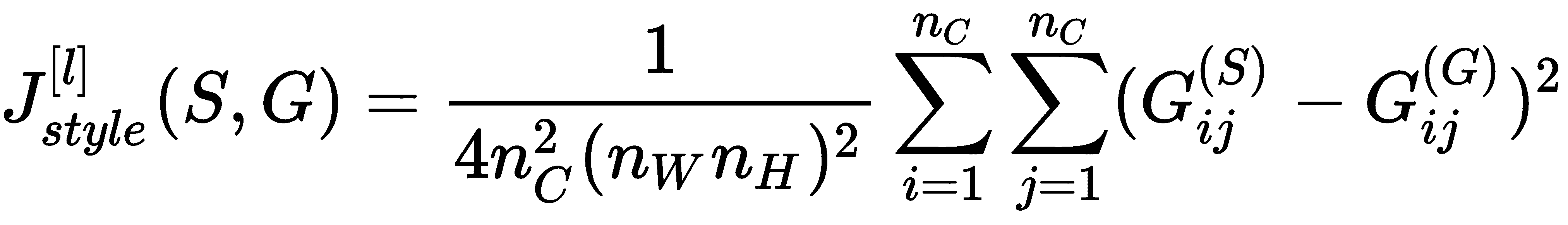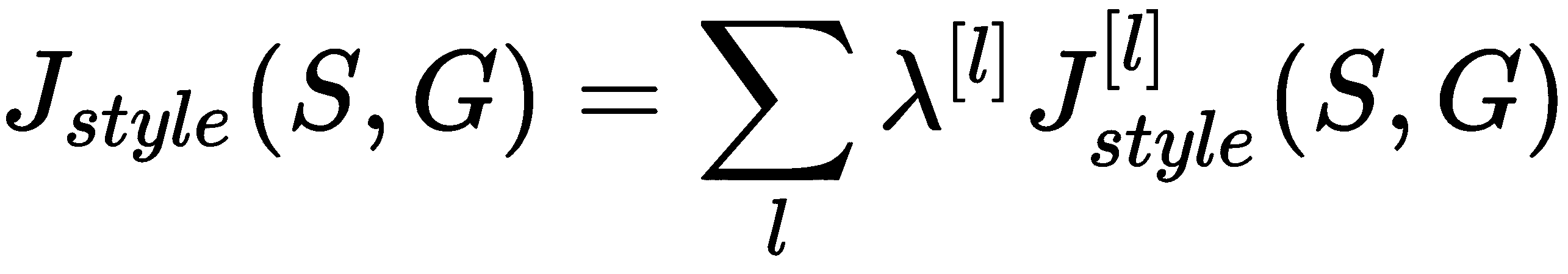 我们希望最小化图像 S 和 G 的 Gram 矩阵之间的距离。整体加权样式损失(我们希望最小化)表示为:
