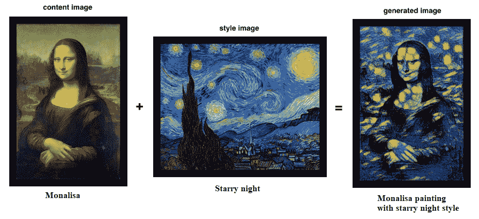 NST 算法使用这些参数创建第三个生成的图像(G)。生成的图像 G 将图像 C 的内容与图像 S 的样式相结合。