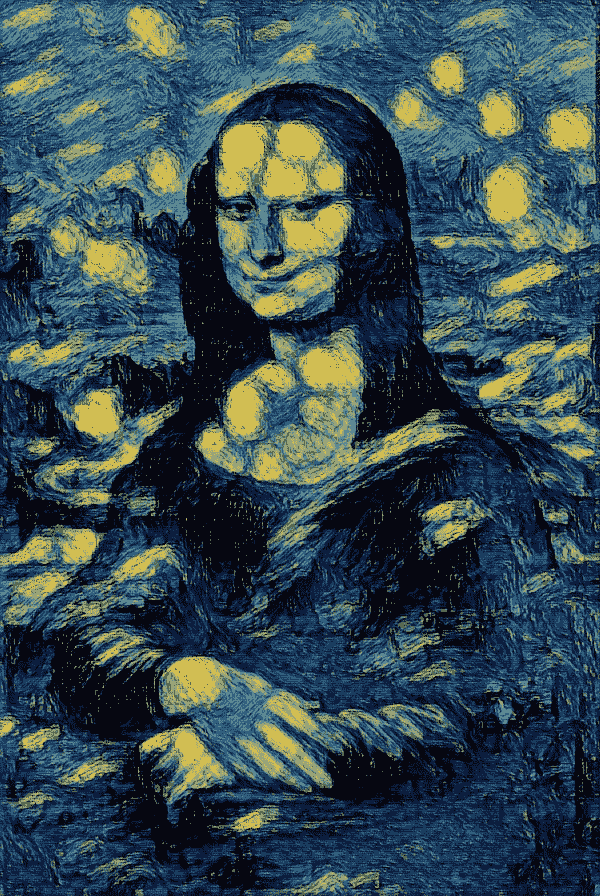 以下是由深度学习模型生成的输出图像,其中星夜图像的样式被传输到蒙娜丽莎的内容输入图像上: