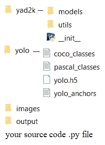 yad2k文件夹从YAD2K-master文件夹复制到当前路径。现在,您当前的路径应该有两个文件夹yad2k和yolo - 在当前路径中创建一个名为