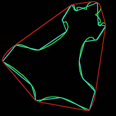 如您所见,凸包围绕着整个主体,近似多边形是最里面的多边形,在两者之间是原始轮廓,主要由圆弧组成。