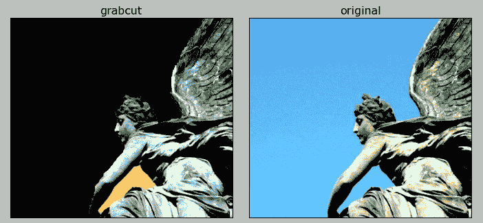 我们想抓住我们的天使并抛弃背景。 为此,我们将创建一个相对较短的脚本,该脚本将使用 GrabCut 分割图像,然后将结果前景图像与原始图像并排显示。 我们将使用matplotlib这个流行的 Python 库,该函数使显示图表和图像成为一项微不足道的任务。