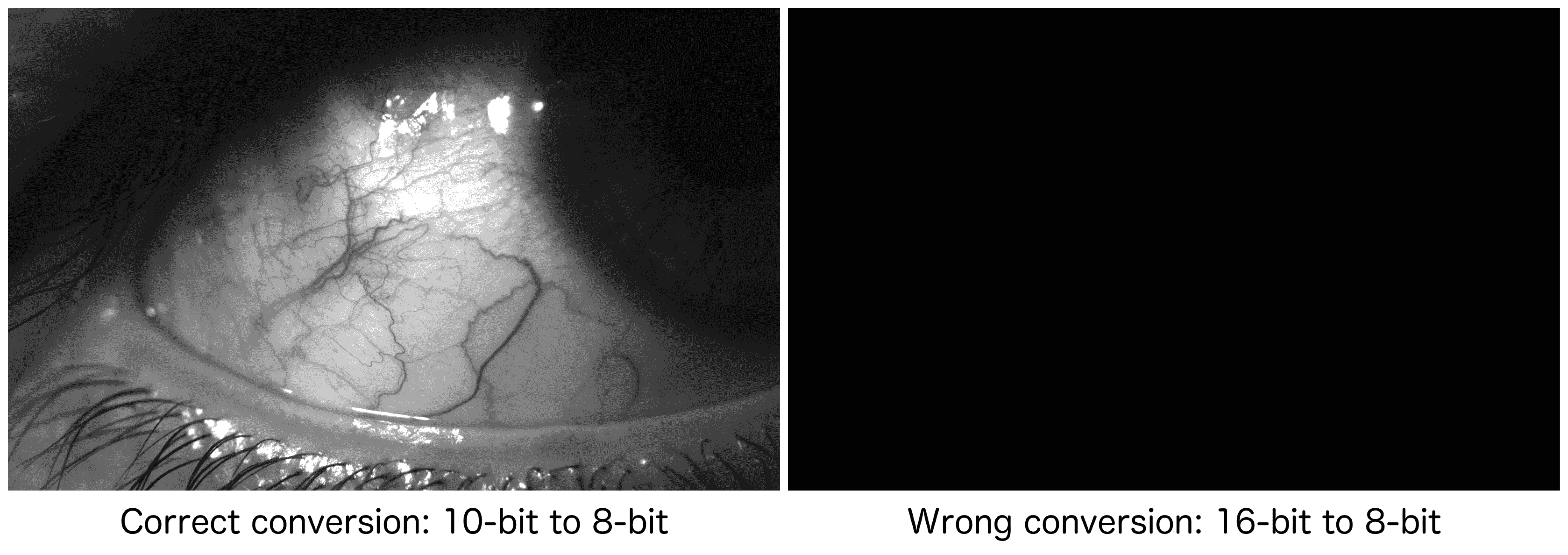 考虑以下用 10 位灰度相机捕获的眼睛图像示例。 在左侧,我们看到了从 10 位标度到 8 位标度正确转换的结果。 在右侧,基于错误的假设,即图像使用 16 位缩放,我们看到转换错误的结果: