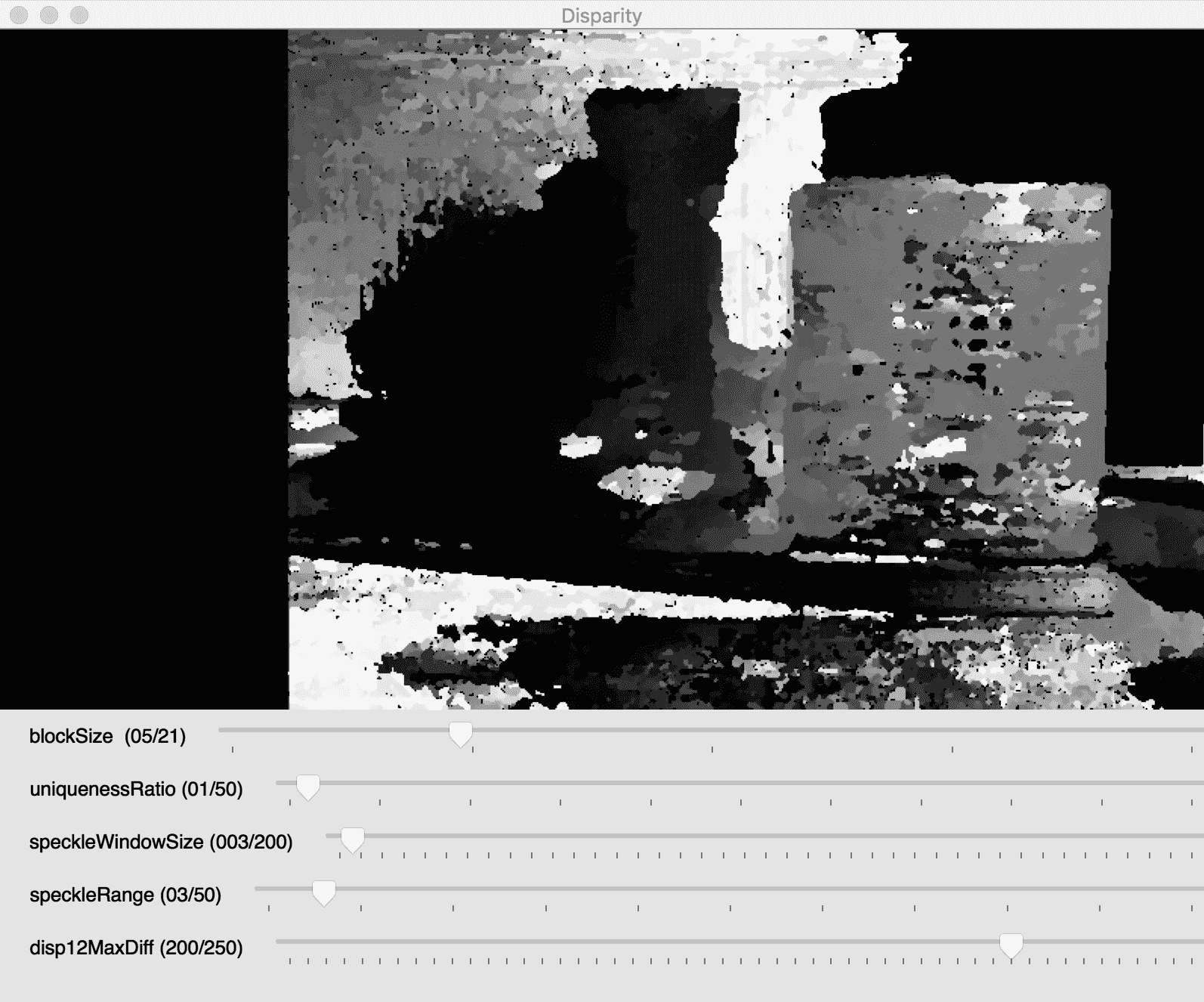 使用前面的脚本,您将能够加载您选择的图像并使用参数,直到对StereoSGBM生成的视差图满意为止。