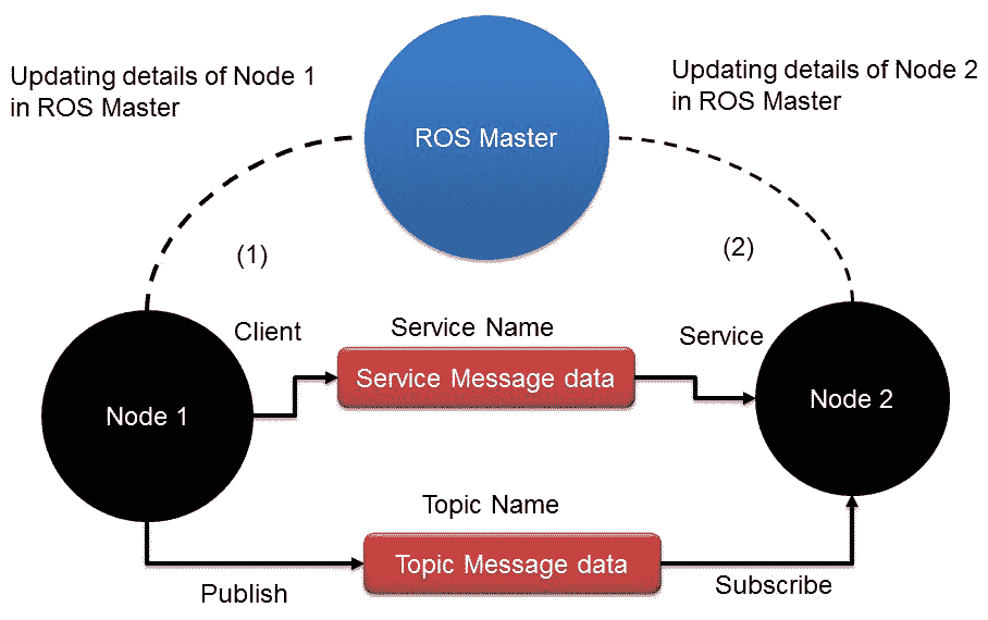 ROS 服务以相同的方式工作。 ROS 主机是一种 DNS 服务器,当第二个节点向第一个节点请求主题或服务时,可以共享节点详细信息。 ROS 使用的通信协议是 TCPROS,它基本上使用 TCP/IP 套接字进行通信。