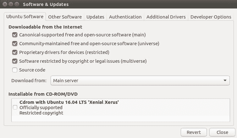 - 配置您的 Ubuntu 存储库,以允许受限制的,Universe 和多版本的可下载文件。 我们可以使用 Ubuntu 的软件和更新工具对其进行配置。 我们可以通过简单地在 Ubuntu Unity 搜索菜单上进行搜索并勾选以下屏幕快照中的显示来获得此工具: