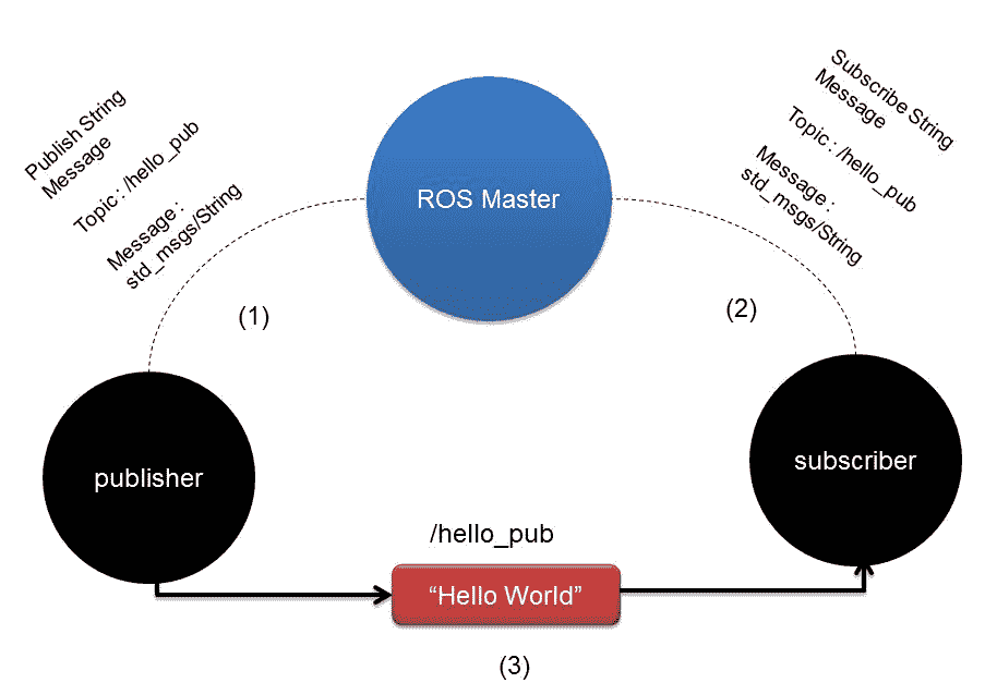 在上图中,您可以看到两个 ROS 节点以及它们之间的 ROS 主机。 我们必须记住的一件事是,在启动 ROS 中的任何节点之前,您应该启动 ROS 主机。 ROS 主机就像节点之间的中介程序一样,用于交换有关其他 ROS 节点的信息以建立通信。 假设节点 1 要发布消息类型为abc的名为/xyz的主题。 它将首先接近 ROS 主机,并说I am going to publish a topic called /xyz with message type abc and share its details。 当另一个节点(例如节点 2)想要订阅消息类型为abc的同一主题/xyz时,主节点将共享有关节点 1 的信息,并分配一个端口以直接开始这两个节点之间的通信,而无需与 ROS 主机通信。
