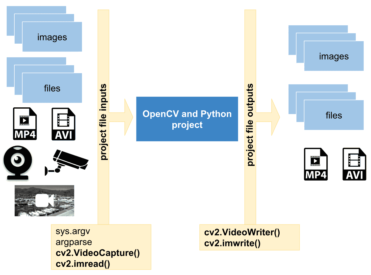 在上图中,您可以看到计算机视觉项目(例如 OpenCV 和 Python 项目)应处理一些输入文件(例如文件和图片)。 另外,经过一些处理后,项目可以输出一些文件(例如图像和文件)。 因此,在本章中,我们将了解如何满足这些要求以及如何正确实现此流程(输入-处理-输出)。