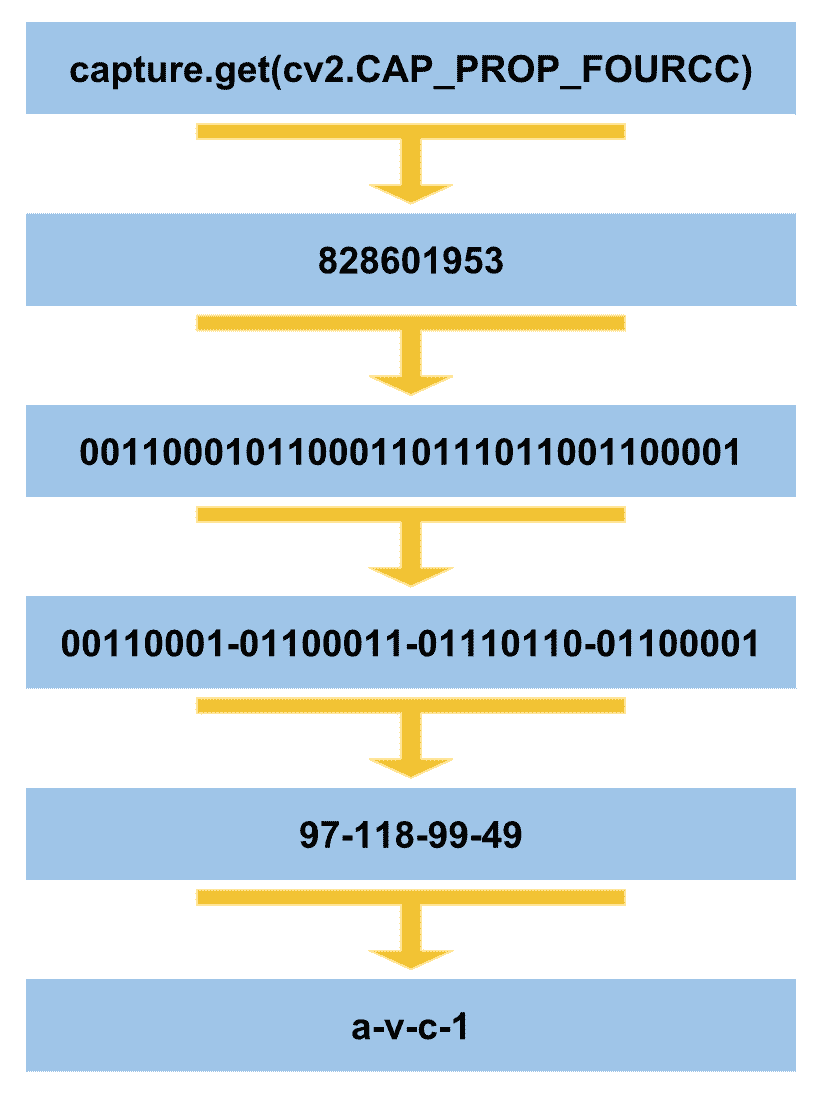 如您所见,第一步是获取capture.get(cv2.CAP_PROP_FOURCC)返回的值的int表示形式,该值是一个字符串。 然后,我们迭代四次以获取每八位,并将这八位转换为int。 最后,使用chr()函数将这些int值转换为char。 应该注意的是,我们只能在一行代码中执行此功能,如下所示: