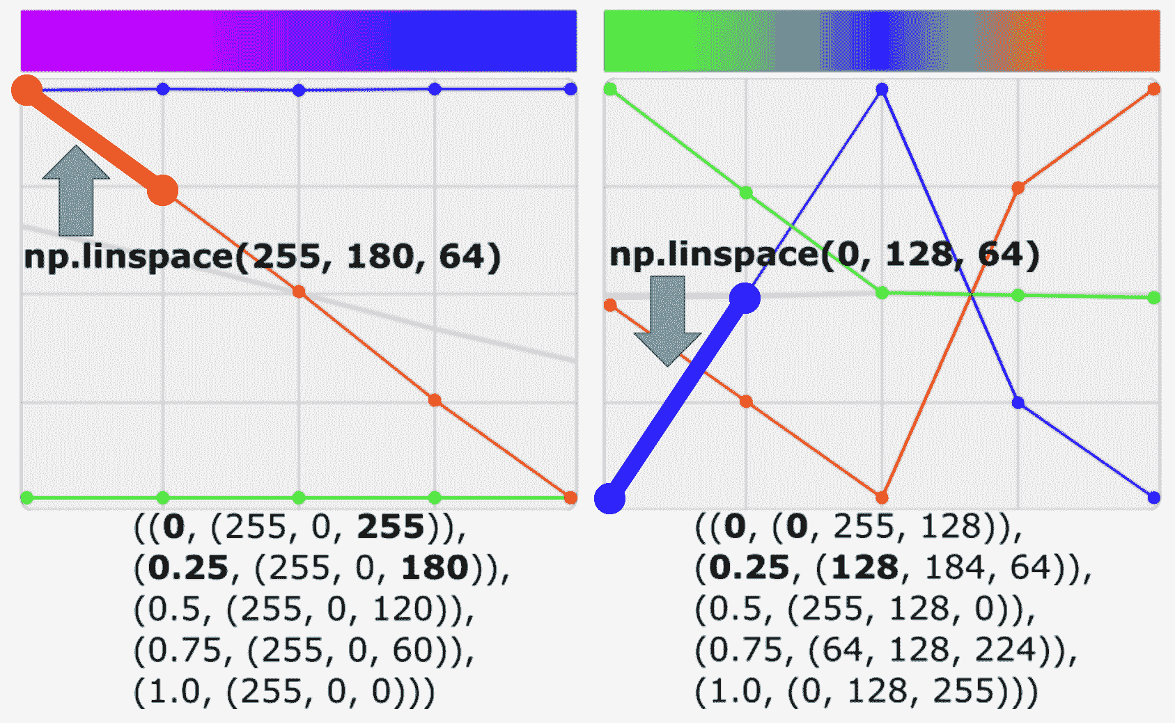最后,为了构建以下五个关键色点((0, (0, 255, 128))(0.25, (128, 184, 64))(0.5, (255, 128, 0))(0.75, (64, 128, 224))(1.0, (0, 128, 255)))的查找表,对np.linespace()进行了以下调用: