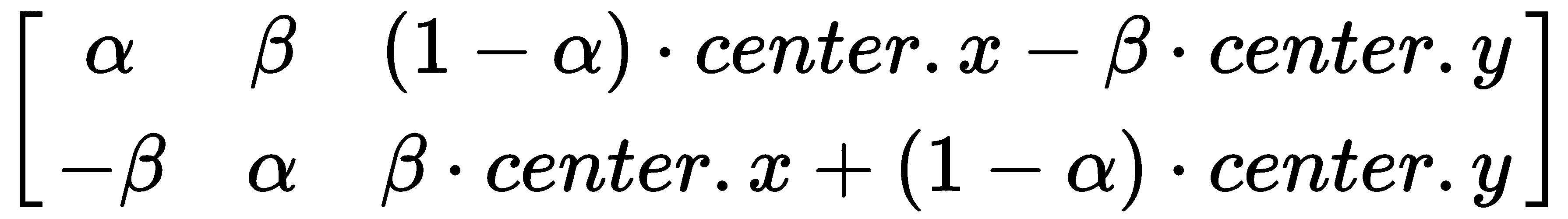 为了旋转图像,我们利用cv.getRotationMatrix2D()函数来构建2 x 3变换矩阵。 该矩阵以所需角度(以度为单位)旋转图像,其中正值表示逆时针旋转。 旋转centerscale因子也都可以调整。 在我们的示例中使用这些元素,将计算以下转换矩阵: