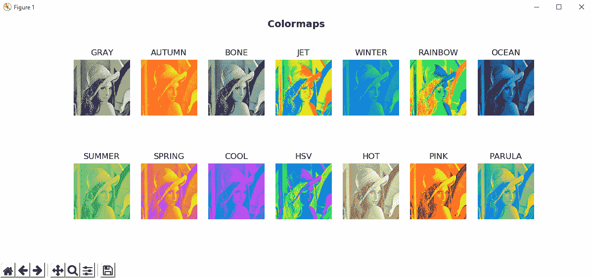 color_map_all.py脚本将所有这些颜色映射应用于灰度图像。 在以下屏幕截图中可以看到此脚本的输出: