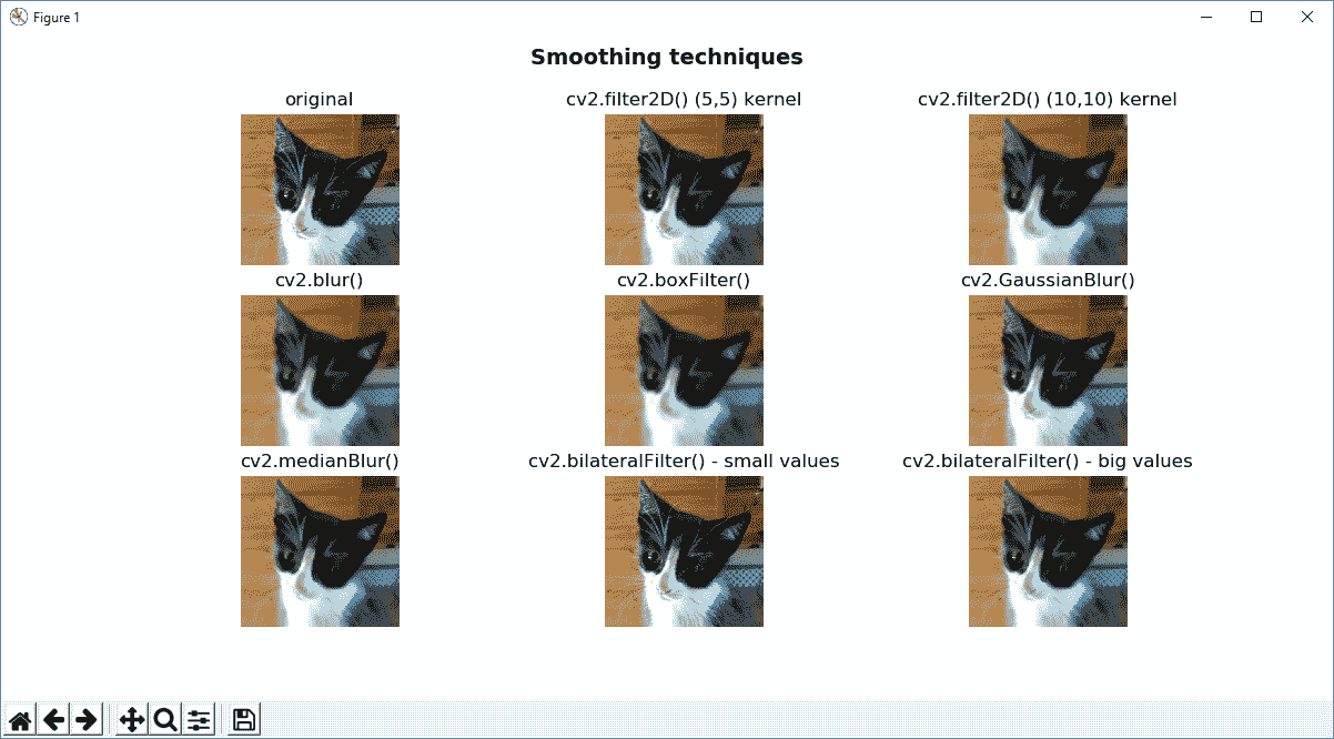 如前所述,在smoothing_techniques.py脚本中,您将看到其他常用的滤波技术来执行平滑操作。 平滑技术通常用于减少噪声,此外,这些技术还可应用于减少低分辨率图像中的像素化效果。 这些技术评论如下。