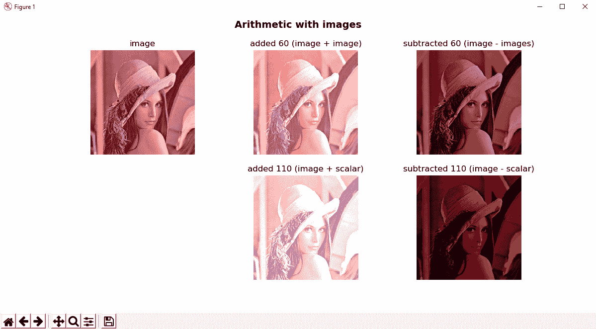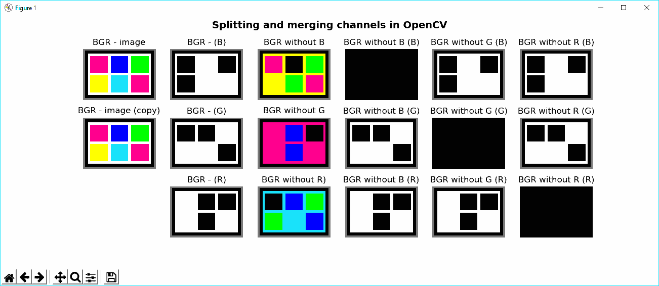 为了理解此屏幕截图,您应该记住 RGB 颜色空间的累加属性。 例如,使用不带 B 的 BGR 子图,您可以看到它大部分是黄色的。 这是因为绿色和红色值产生黄色。 您可以看到的另一个关键特征是与我们设置为0的特定通道相对应的黑色子图。