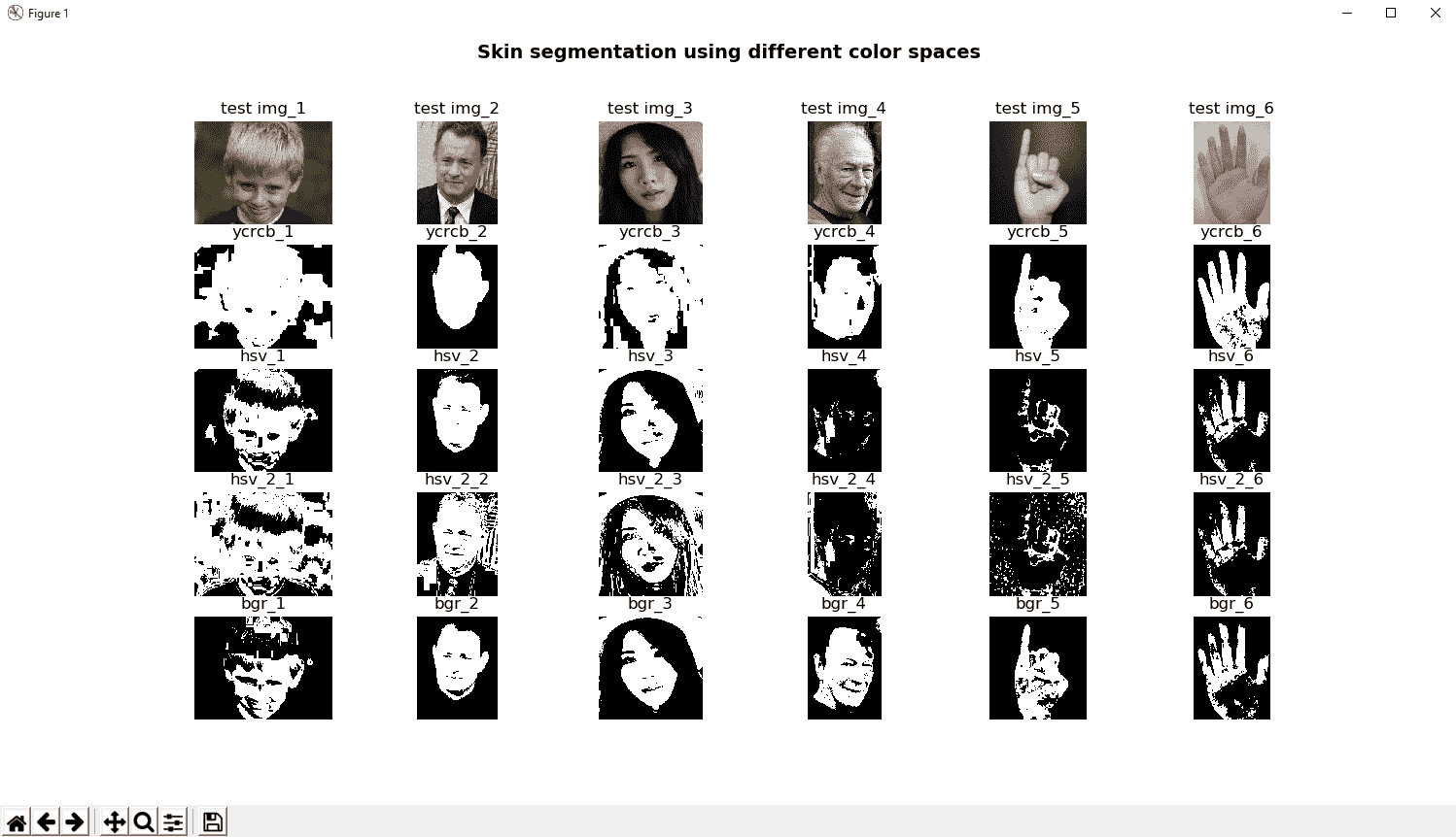 skin_detectors词典已构建为将所有皮肤分割算法应用于测试图像。 如果我们打印它,输出将如下所示:
