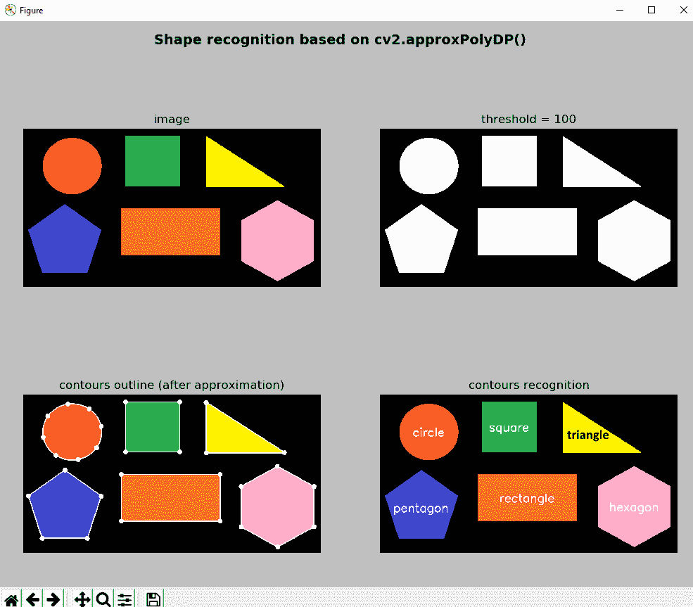 我们先前已经介绍了cv2.approxPolyDP(),使用道格拉斯-皮克算法(Douglas-Peucker algorithm)可以用较少的点将一个轮廓与另一个轮廓近似。 此函数的关键参数是epsilon,它设置近似精度。 在contours_shape_recognition.py中,我们将使用cv2.approxPolyDP()来基于抽取的轮廓中检测到的顶点数量(例如三角形,正方形,矩形,五边形或六边形等)识别轮廓。 cv2.approxPolyDP()的输出)。 为了减少给定轮廓的点数,我们首先计算轮廓的周长。 基于周长,将建立epsilon参数。 这样,抽取的轮廓就不会缩放。 ε参数的计算如下: