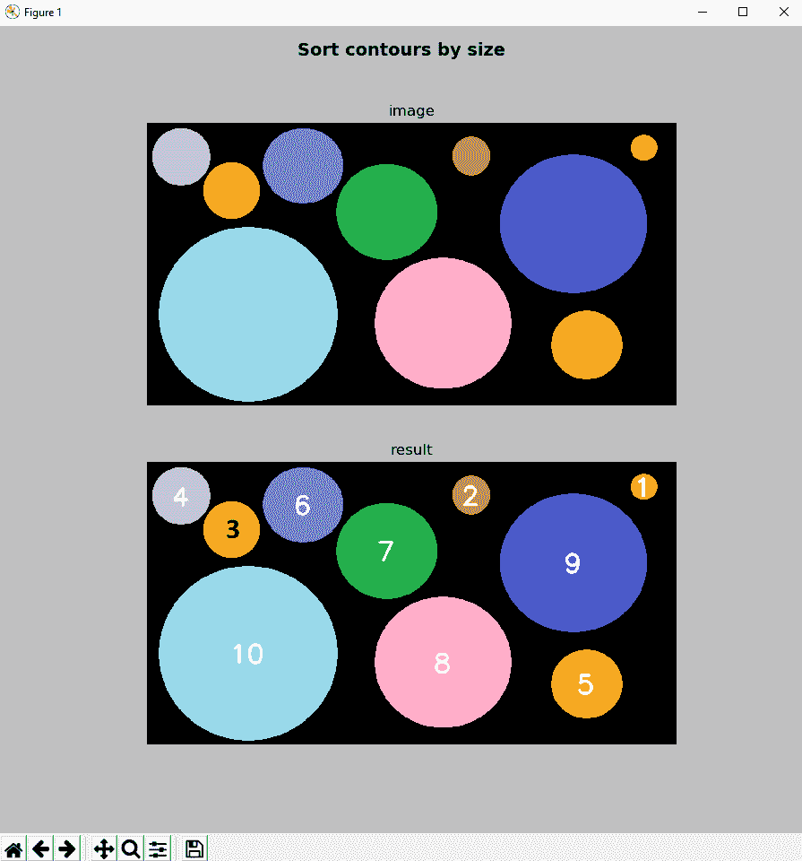 因此,sort_contours_size()函数根据尺寸对轮廓进行分类。 同样,脚本在轮廓的中心输出序号。 contours_sort_size.py的输出可以在下一个屏幕截图中看到: