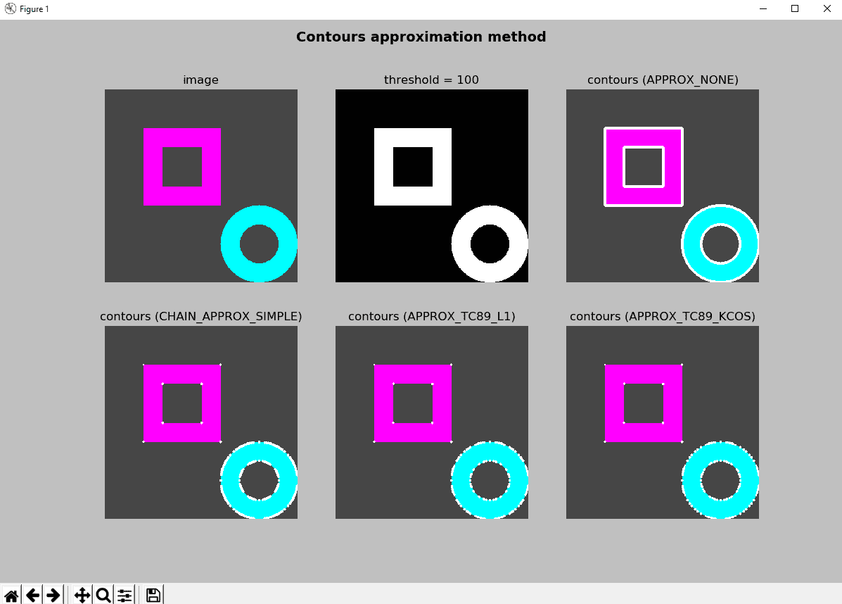 检测到的轮廓可以压缩以减少点数。 从这个意义上讲,OpenCV 提供了几种减少点数的方法。 可以使用参数method进行设置。 另外,可以通过将标志设置为cv2.CHAIN_APPROX_NONE(所有边界点都存储在其中)来禁用此压缩; 因此,不执行压缩。