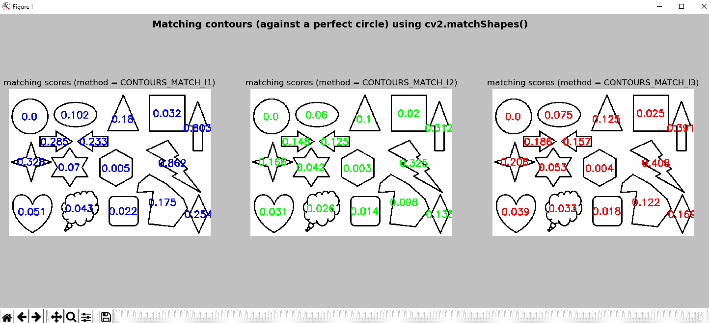 ret_1 = cv2.matchShapes(contours_circle[0], contour, cv2.CONTOURS_MATCH_I1, 0.0)