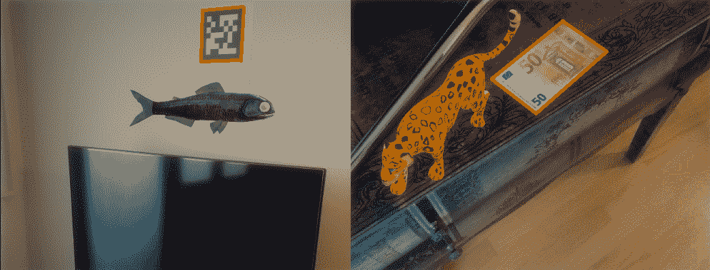 在前面的屏幕快照的左侧,您可以看到一个基于标记的方法的示例,该标记用于从四个角计算摄像机的姿势。 此外,在右侧,您可以看到基于无标记方法的示例,其中 50 欧元的钞票用于计算相机姿态。 以下各节将说明这两种方法。