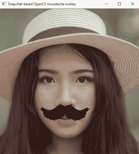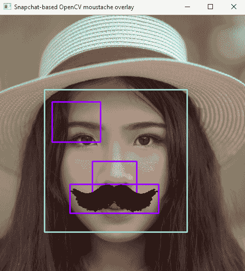 一旦检测到鼻子,我们将在所有检测到的鼻子上进行迭代,并计算出胡须覆盖的区域。 执行基本检查以滤除假鼻子位置。 如果成功,则胡子将基于先前计算的区域覆盖在图像上: