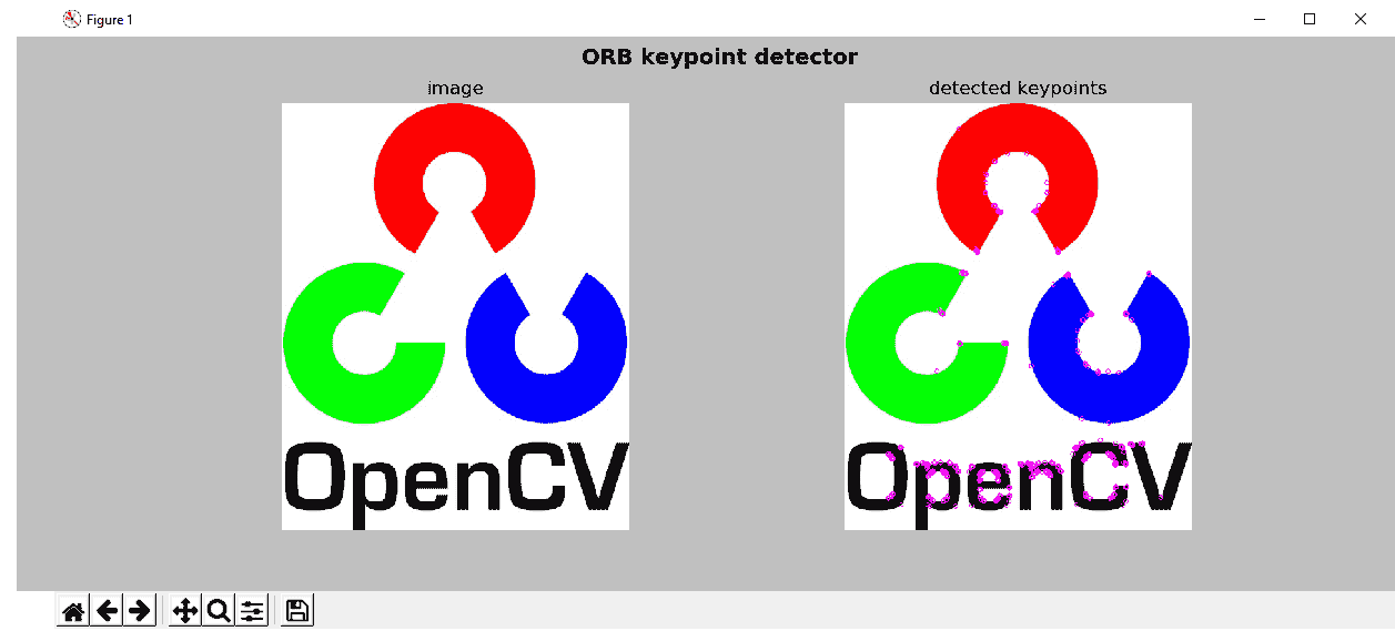 注意,您还可以执行orb.detectAndCompute(image, None)来检测keypoints并计算检测到的keypoints的描述符。 最后,我们可以使用cv2.drawKeypoints()函数绘制检测到的keypoints: