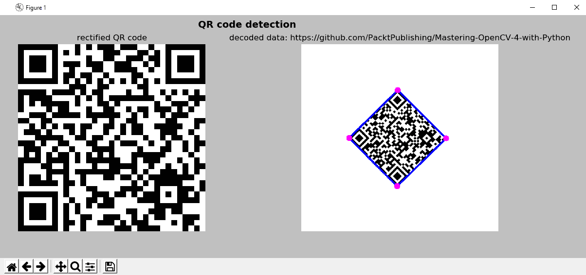 在前面的屏幕截图中,您可以看到经过校正和二值化的 QR 码(左)和检测到的标记(右),带有蓝色边框,洋红色正方形点突出显示检测结果。