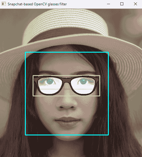 青色矩形表示图像中检测到的脸部的位置和大小。 洋红色矩形表示图像中检测到的眼睛对。 黄色矩形表示将要覆盖眼镜的位置,该位置是根据眼睛对区域的位置和大小计算得出的。 如您所见,已将某些透明度添加到眼镜覆盖的图像中,以使其更加逼真。