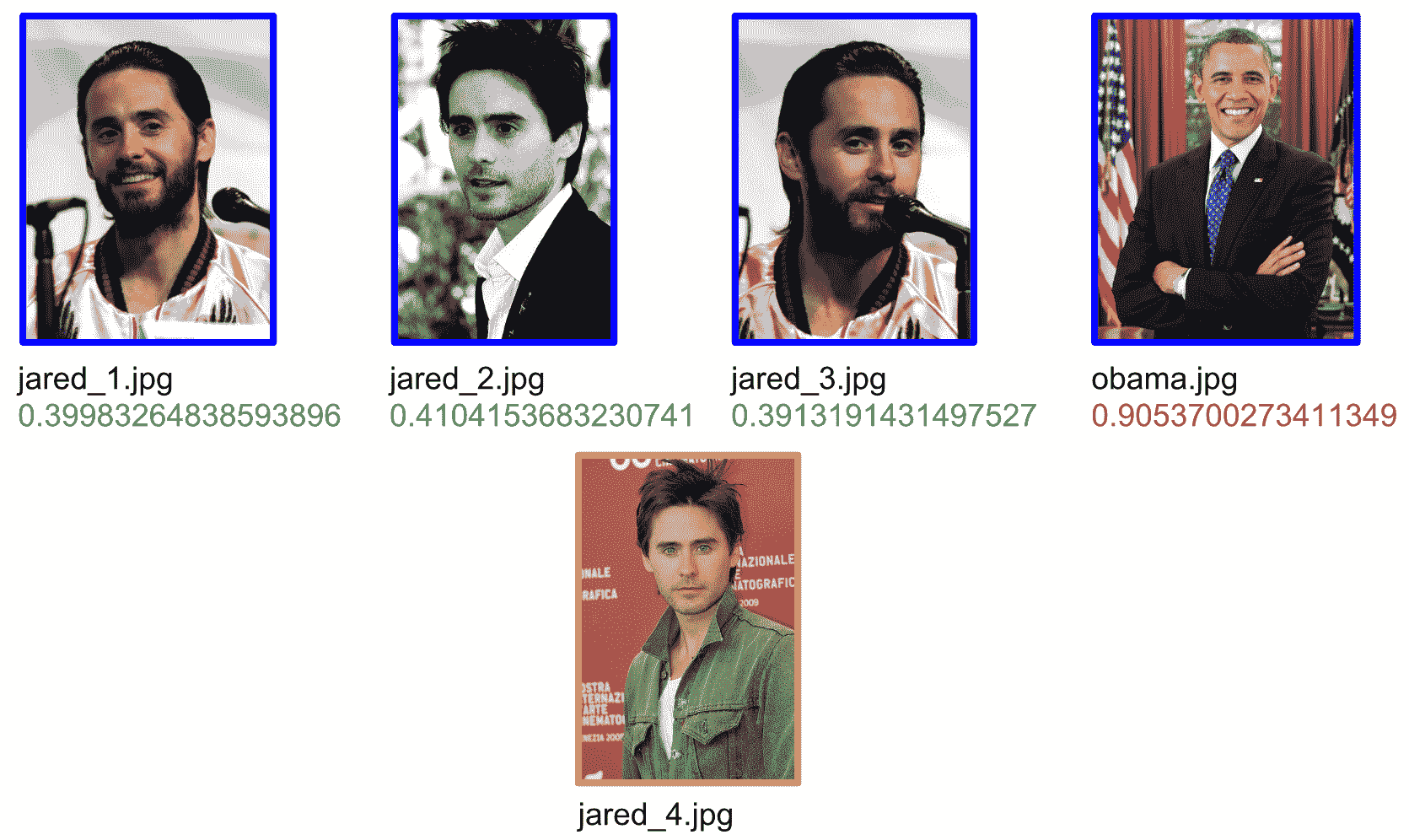 前三个值(0.39131914314975270.399832648385938960.4104153683230741)小于0.6。 这意味着可以从与要检查的图像('jared_4.jpg')相同的人处考虑前三个图像('jared_3.jpg''jared_1.jpg''jared_2.jpg')。 获得的第四值(0.9053700273411349)表示第四张图像('obama.jpg')与要检查的图像不是同一个人。