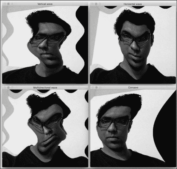 让我们对图像有更多的乐趣,看看还能实现什么。 投影变换非常灵活,但是它们仍然对我们如何变换点施加了一些限制。 如果我们想做完全随机的事情怎么办? 我们需要更多的控制权,对不对? 碰巧我们也可以做到这一点。 我们只需要创建自己的映射即可,这并不困难。 以下是通过图像变形可以实现的一些效果: