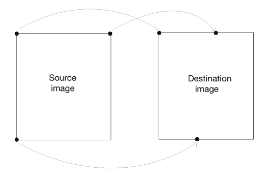 如前所述,我们正在定义控制点。 我们只需要三个点就可以得到仿射变换矩阵。 我们希望将src_points中的三个点映射到dst_points中的相应点。 我们正在映射点,如下图所示: