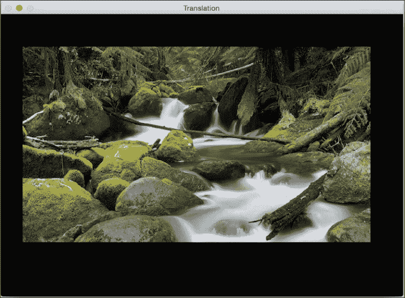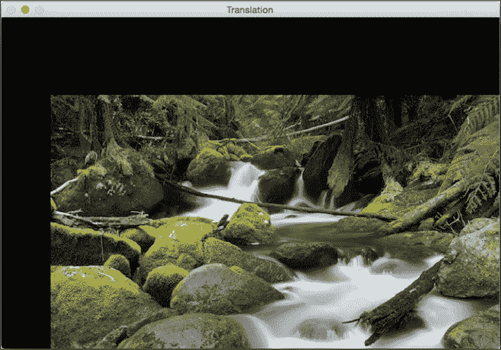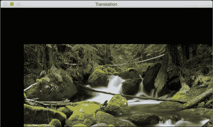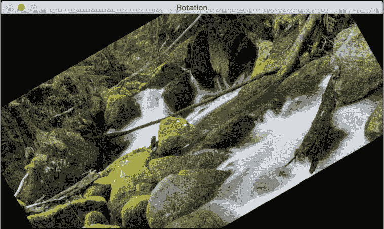在此,θ是逆时针方向的旋转角度。 OpenCV 通过getRotationMatrix2D函数可以更好地控制此矩阵的创建。 我们可以指定围绕图像旋转的点,旋转角度(以度为单位)和图像的缩放因子。 一旦有了转换矩阵,就可以使用warpAffine函数将此矩阵应用于任何图像。