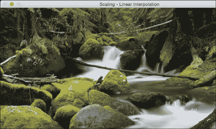 OpenCV 提供了一个称为调整大小的函数来实现图像缩放。 如果未指定大小(通过使用None),则它将期望x和y缩放因子。 在我们的示例中,图像将放大 1.2 倍。 如果使用三次插值进行相同的放大,则可以看到质量有所提高,如下图所示。 以下屏幕截图显示了线性插值的形式:
