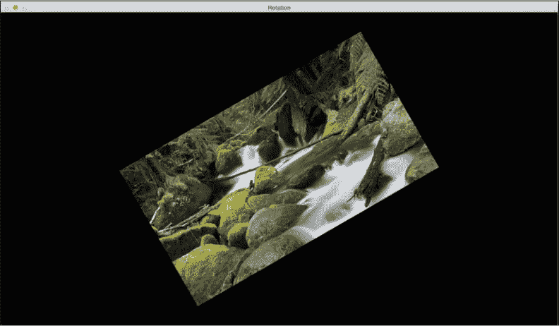 使用getRotationMatrix2D,我们可以将图像围绕其旋转的中心点指定为第一个参数,然后指定旋转角度(以度为单位),最后指定图像的缩放比例。 我们使用 0.7 将图像缩小 30%,使其适合框架。