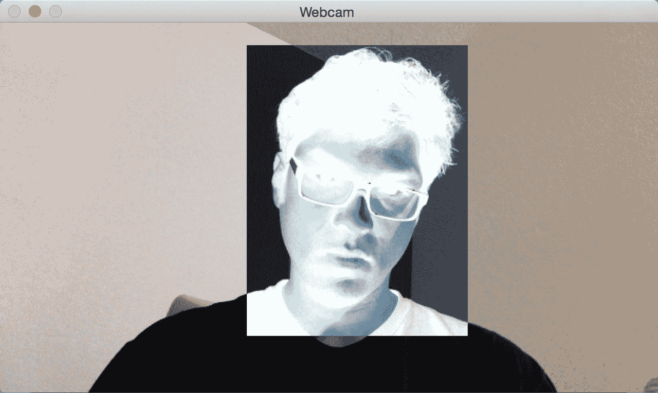 让我们看看如何使用鼠标与网络摄像头中的实时视频流进行交互。 我们可以使用鼠标选择一个区域,然后对该区域应用负片效果,如下图所示: