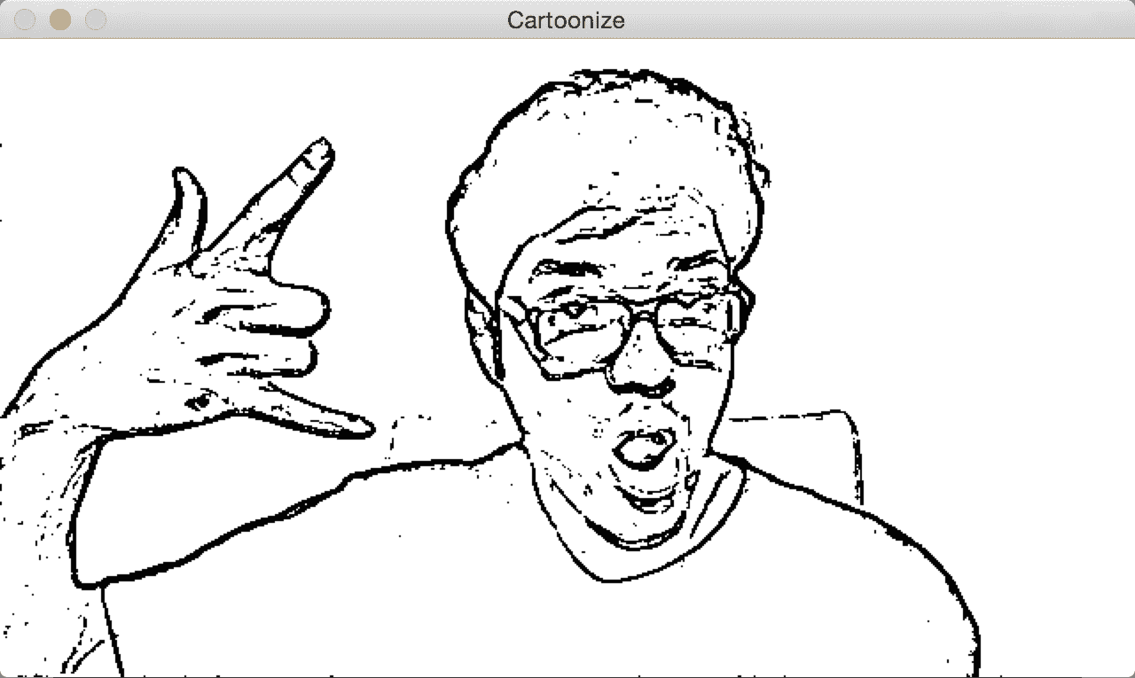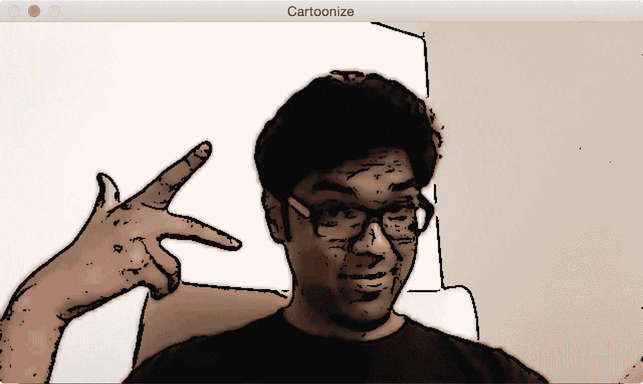 当您运行上述程序时,您将看到一个窗口,其中包含来自网络摄像头的视频流。 如果按S,视频流将变为草图模式,并且您将看到其铅笔状的轮廓。 如果按C,您将看到输入流的彩色卡通版。 如果按任何其他键,它将返回到正常模式。