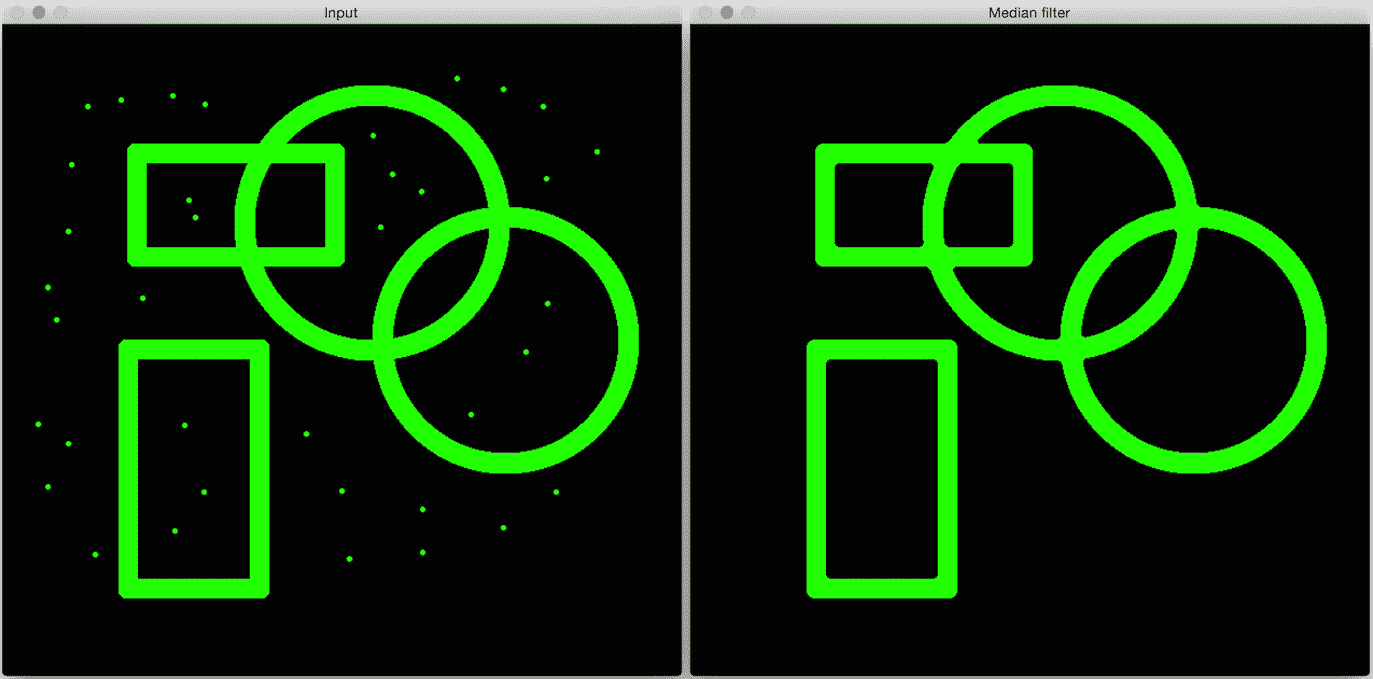 正如我们在输入图像中看到的,有很多孤立的绿色像素。 它们降低了图像的质量,我们需要摆脱它们。 这是中值过滤器派上用场的地方。 我们仅查看每个像素周围的NxN邻域,然后选择这些数字的中值。 由于在这种情况下,孤立的像素具有较高的值,因此取中间值将摆脱这些值,并使图像平滑。 正如您在输出图像中看到的那样,中值过滤器消除了所有这些孤立的像素,并且图像看起来很干净。 以下是此代码: