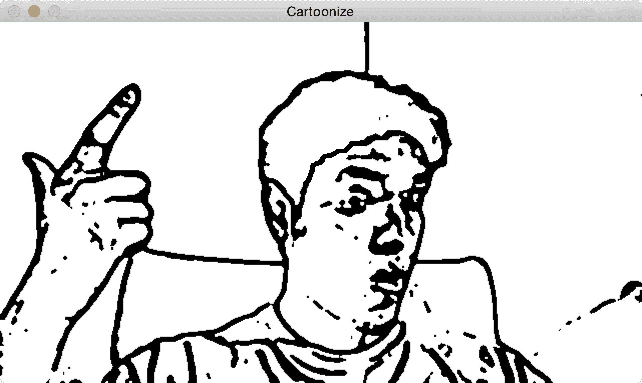 cv2.imshow('Cartoonize', cartoonize_image(frame, ksize=5, sketch_mode=True))