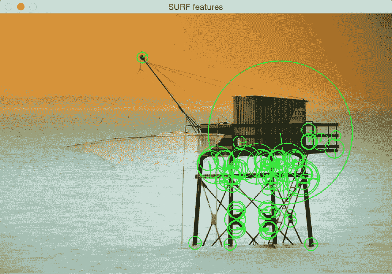 如果在较早的图像上运行 SURF 关键点检测器,您将看到类似以下内容: