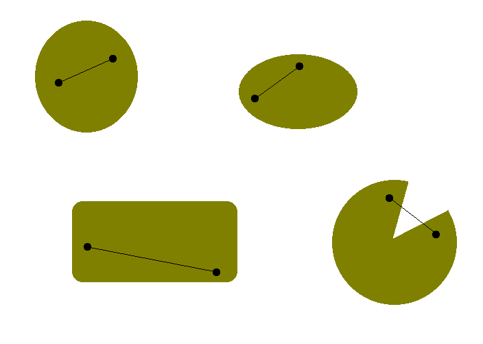这不完全是真实的图像,但是您可以理解。 你知道我们在谈论什么形状。 由于我们不知道要寻找的是什么,因此需要使用这些形状的某些属性来识别切片的比萨饼。 如果您注意到,所有其他形状都很好地封闭了; 也就是说,您可以在这些形状中选取任意两个点并在它们之间画一条线,并且该线将始终位于该形状之内。 这些形状称为凸形。