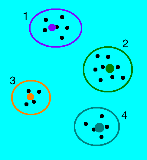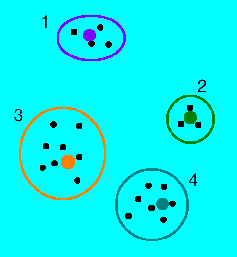 如您所见,我们有四个质心。 请记住,图中显示的点代表特征空间,而不是图像中这些特征点的实际几何位置。 上图中以这种方式显示了它,因此很容易可视化。 图像中许多不同几何位置的点在特征空间中可以彼此靠近。 我们的目标是将该图像表示为直方图,其中每个箱子对应于这些质心之一。 这样,无论我们从图像中提取多少个特征点,都将始终将其转换为固定长度的特征向量。 因此,我们将每个特征点四舍五入到其最近的质心,如下图所示: