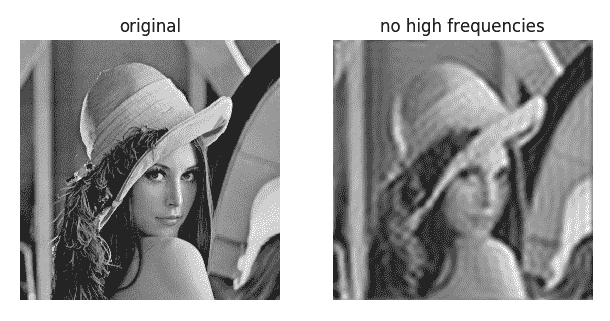 使用快速傅立叶变换,我们将图像从空间域转换到频域。 然后,我们创建一个遮罩,该遮罩的各处都为零,但中心处的矩形除外。 使用该遮罩,我们将高频的振幅设置为零,然后将图像转换回空间表示形式。