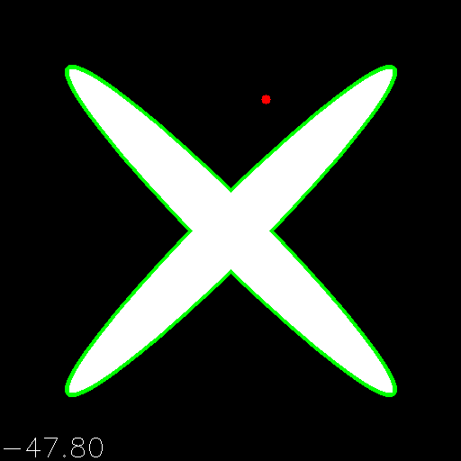 OpenCV 中有一个特殊函数,可测量从点到轮廓的最小距离。 称为cv2.pointPolygonTest。 它接受三个参数,并返回测得的距离。 参数是轮廓,点和布尔标志,我们将在稍后讨论它们的目的。 结果距离可以为正,负或等于零,分别对应于轮廓内部,轮廓外部或轮廓点位置。 最后一个布尔参数确定我们的函数返回的是精确距离还是仅返回具有值的指示符(+1; 0; -1)。 指示器的符号与计算精确距离的模式具有相同的含义。
