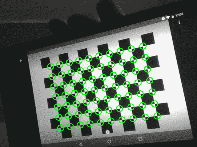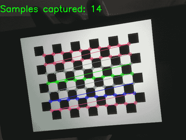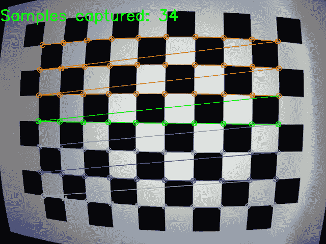 - 从相机捕获帧,检测每个帧上的棋盘图案,并累积帧和角,直到我们有足够多的样本: